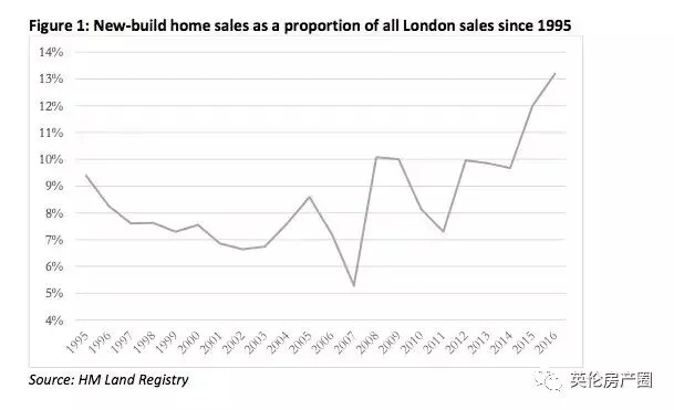 1995年,伦敦的新房销售量仅占伦敦整体住宅销售量的10%。去年,这个比例缓慢上升到了13%......而已......