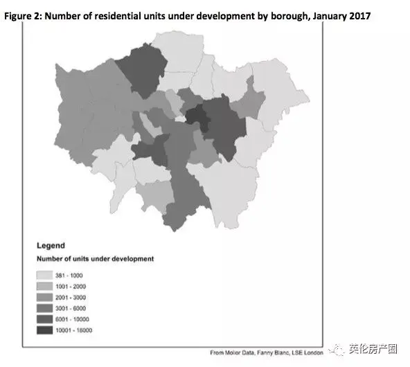 如下图所示:2017年1月伦敦各个地区新建的住房数量如下,颜色越深代表住宅数量越多。