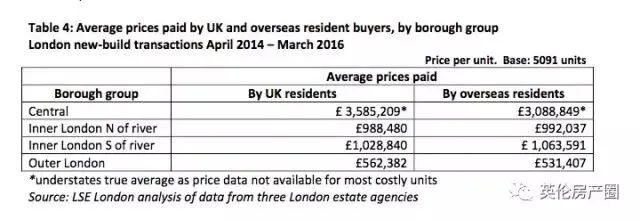 如下表所示:伦敦市中心,内伦敦北部南部和外伦敦地区英国买家和海外买家购房价格差异。