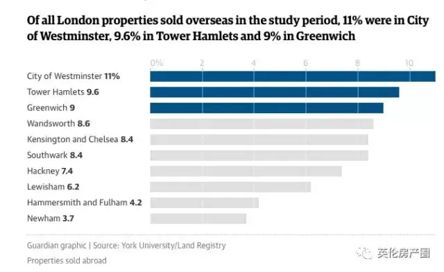 伦敦富人区所在地Westminster海外买家比重最大,占约11%。