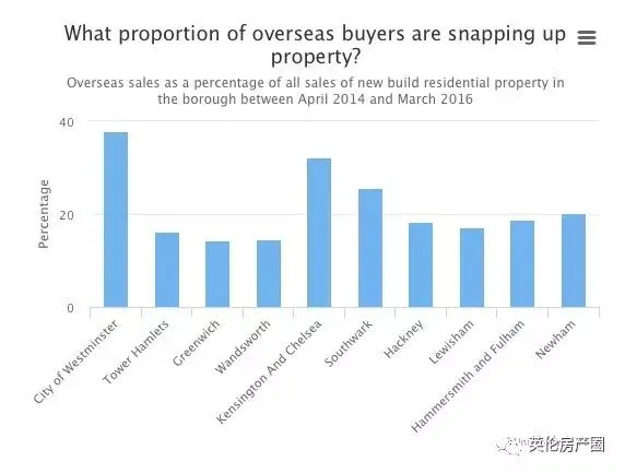 伦敦市中心富人区所在地Westminster海外买家比重依然最大,为37.9%。