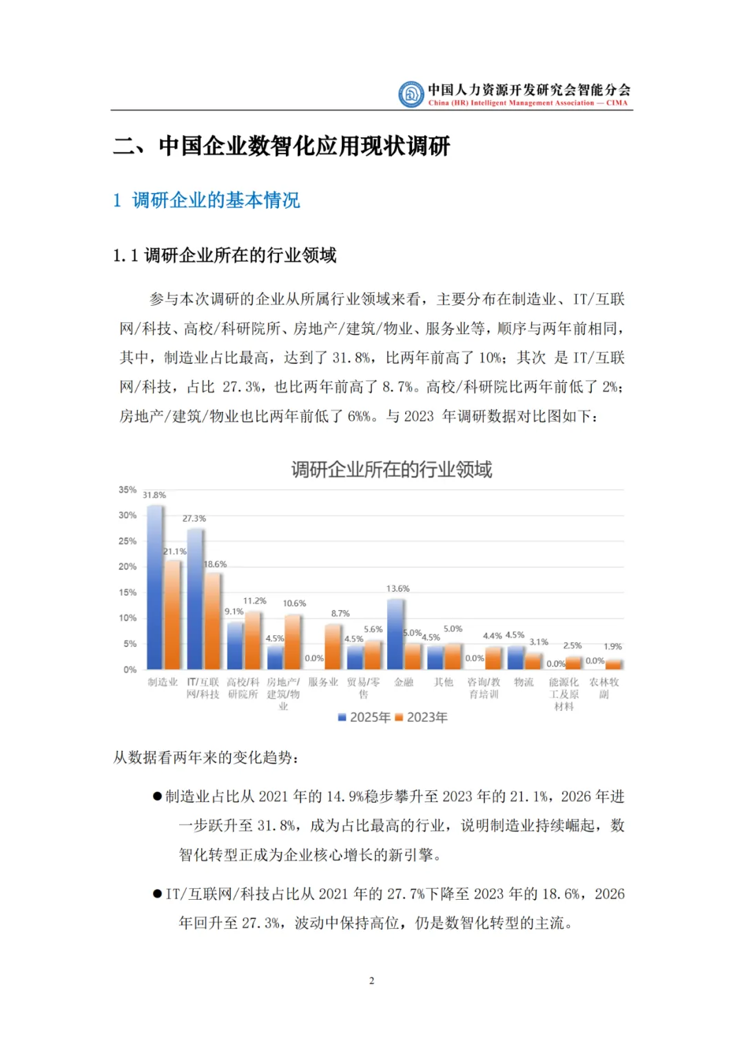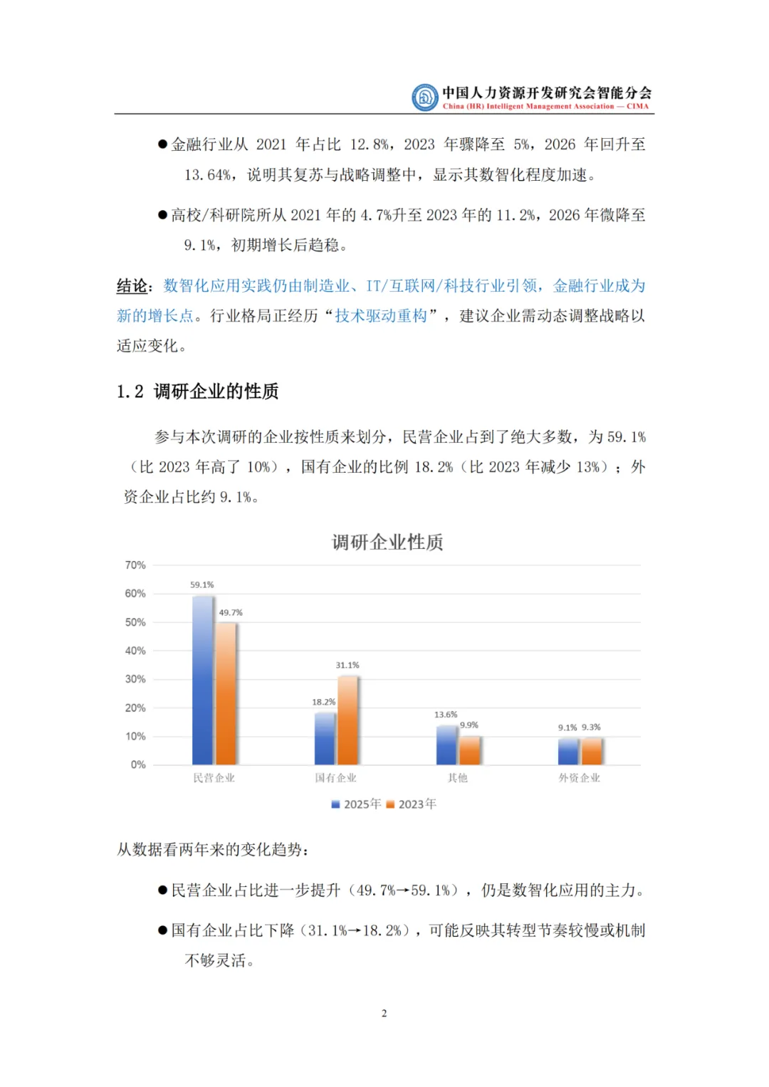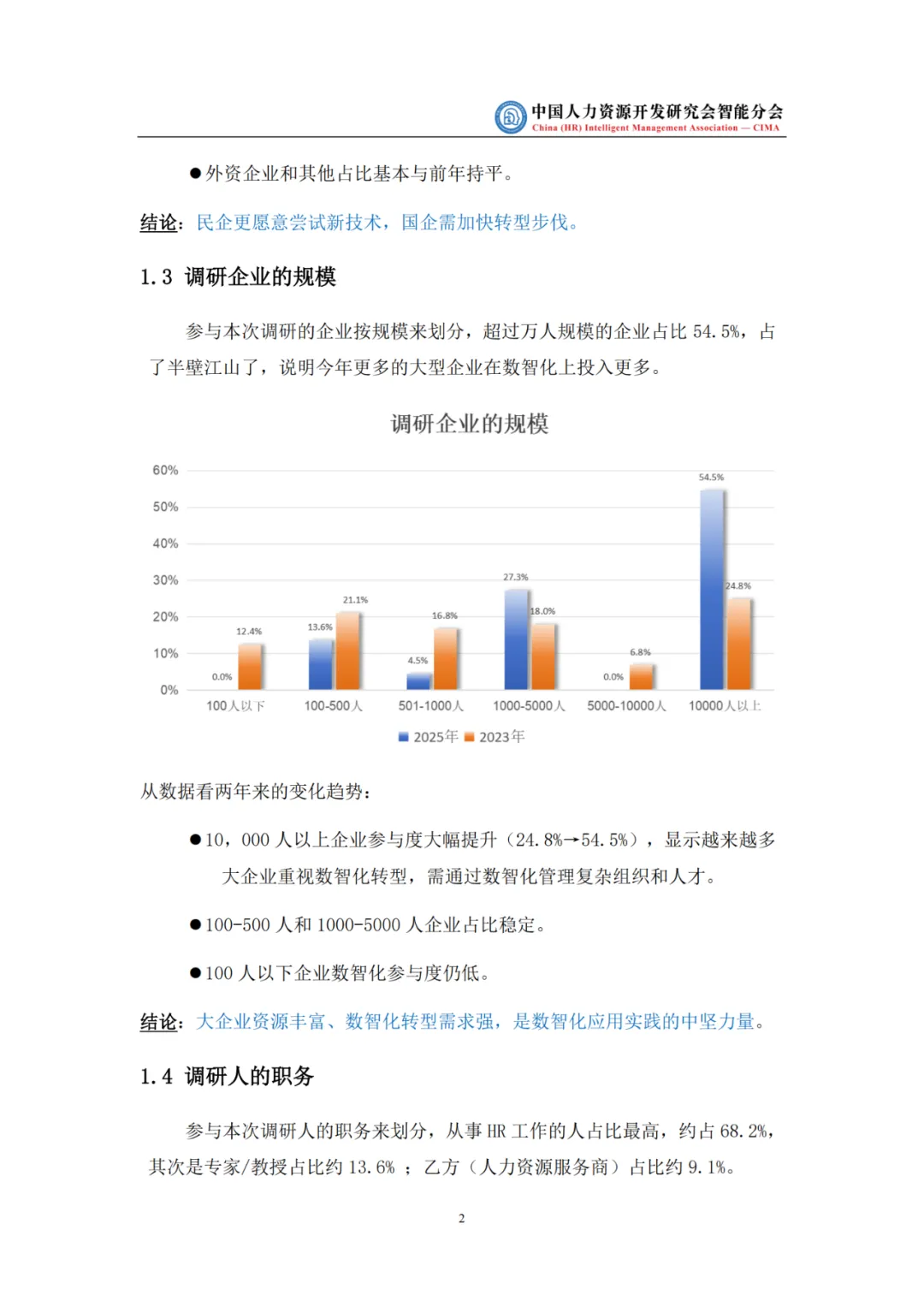 制造业(31.8%)与IT/互联网/科技(27.3%)行业成为转型“排头兵”,这是数字经济浪潮下的必然结果——前者需靠数智化破解规模化管理难题,后者则凭借技术基因率先试水。民营企业(59.1%)以灵活机制成为应用主力,展现出极强的创新活力;而超万人规模大型企业(54.5%)的高参与度,更印证了“规模越大,数智化刚需越强”的行业规律。