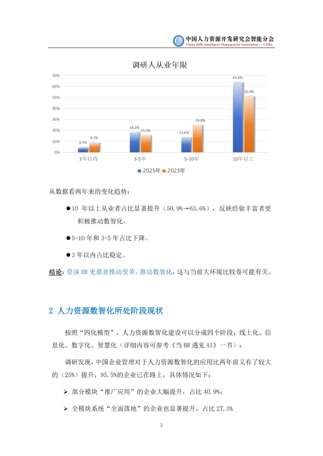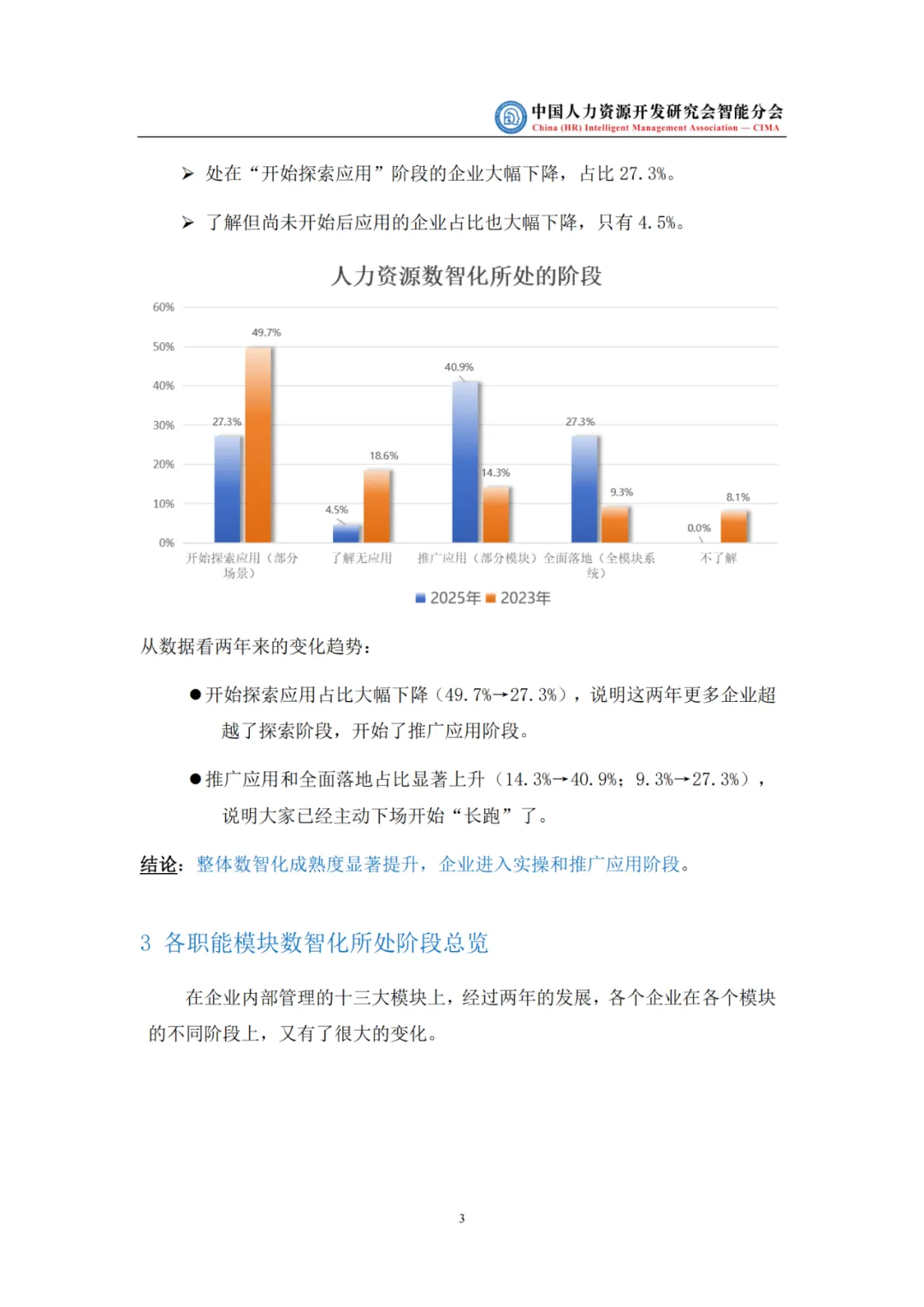 中国人力资源开发研究会智能分会(CIMA)近期发布的《2025中国人力资源数智化发展白皮书》,戳中了行业转型的核心痛点——一场“全员动起来,却半数陷僵局”的奇妙博弈。一方面,超95%的企业已躬身入局HR数智化,近七成迈过试点门槛,进入模块化推广或全系统落地阶段;另一方面,超60%的企业仍被“数据孤岛”与“人才荒”双重桎梏,看似热闹的转型背后,是举步维艰的现实困境。