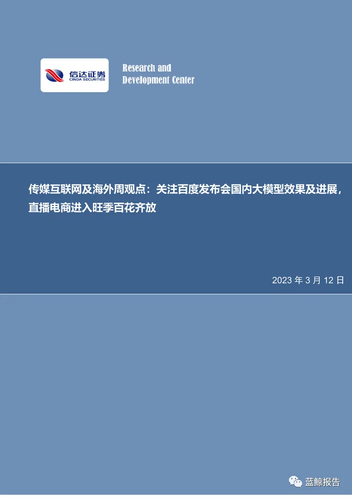 信达证券-传媒互联网行业及海外周观点:关注百度发布会国内大模型效果及进展,直播电商进入旺季百花齐放.pdf