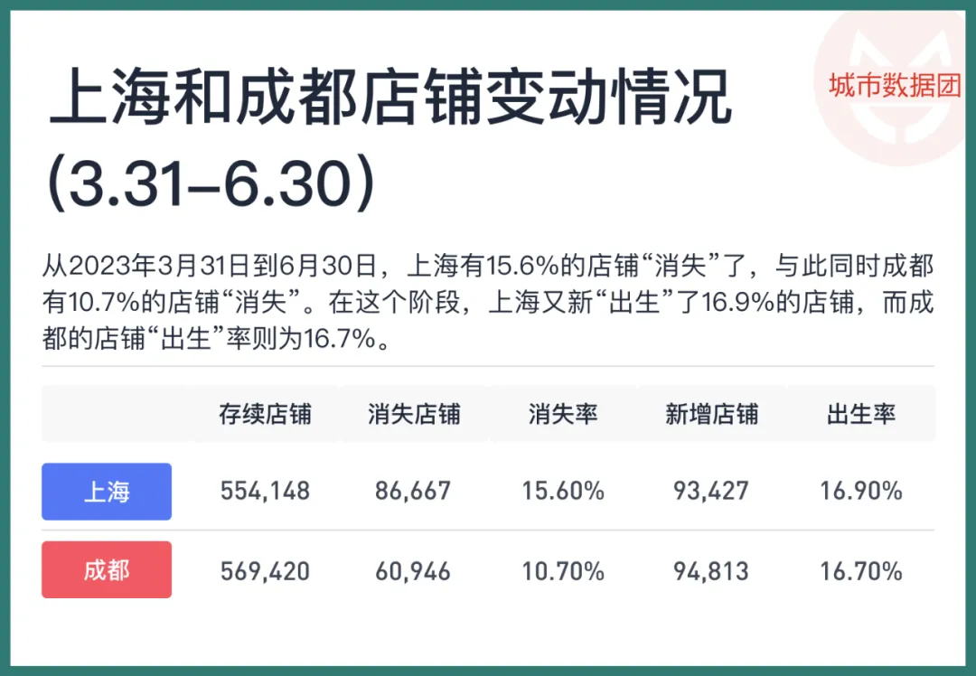 上表显示,从2023年3月31日到6月30日,在沪蓉双城,店铺的总量都是在增长的。上海有15.6%的店铺“消失”了,成都有10.7%的店铺“消失”,与此同时,上海又新“出生”了16.9%的店铺,而成都的店铺“出生”率则为16.7%。