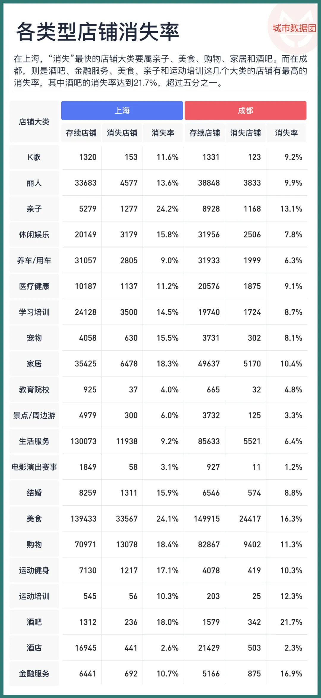 下表列出了不同大类的店铺在上海和成都的消失率。