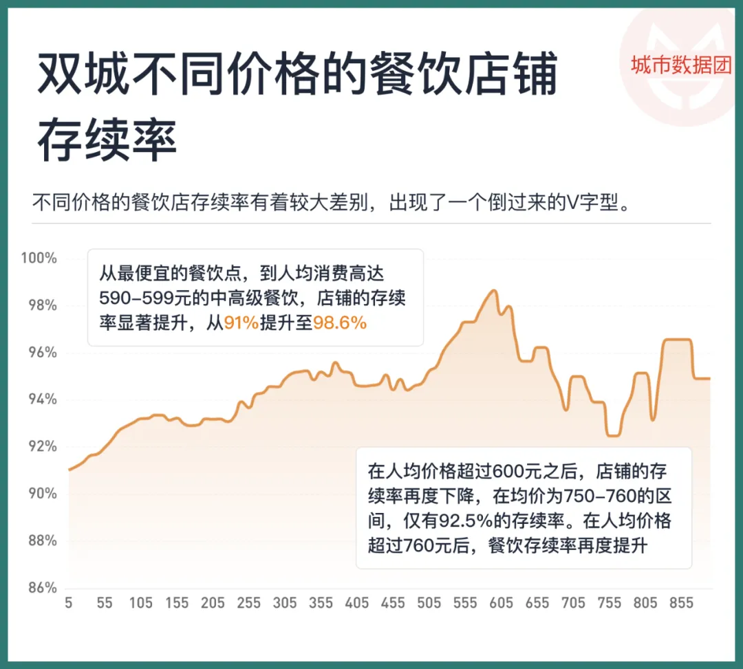 在人均价格超过600元之后,店铺的存续率再度下降,在均价为750-760的区间,仅有92.5%的存续率。在人均价格超过760元后,餐饮存续率再度提升。