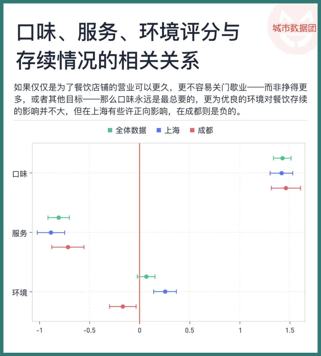 上图显示了三组点以及他们的置信区间。在红线右边,代表的是这个部分的评分提高,对于存续有正的影响。例如无论是上海、成都,还是两个城市加总的所有数据,“口味”评分对于这个餐饮店是否能够存续,都有极为显著的影响,其系数大小约为1.5,表示该店铺的存续率会上升1.5个标准差,即存续概率在边际上有26%到30%左右的提升。