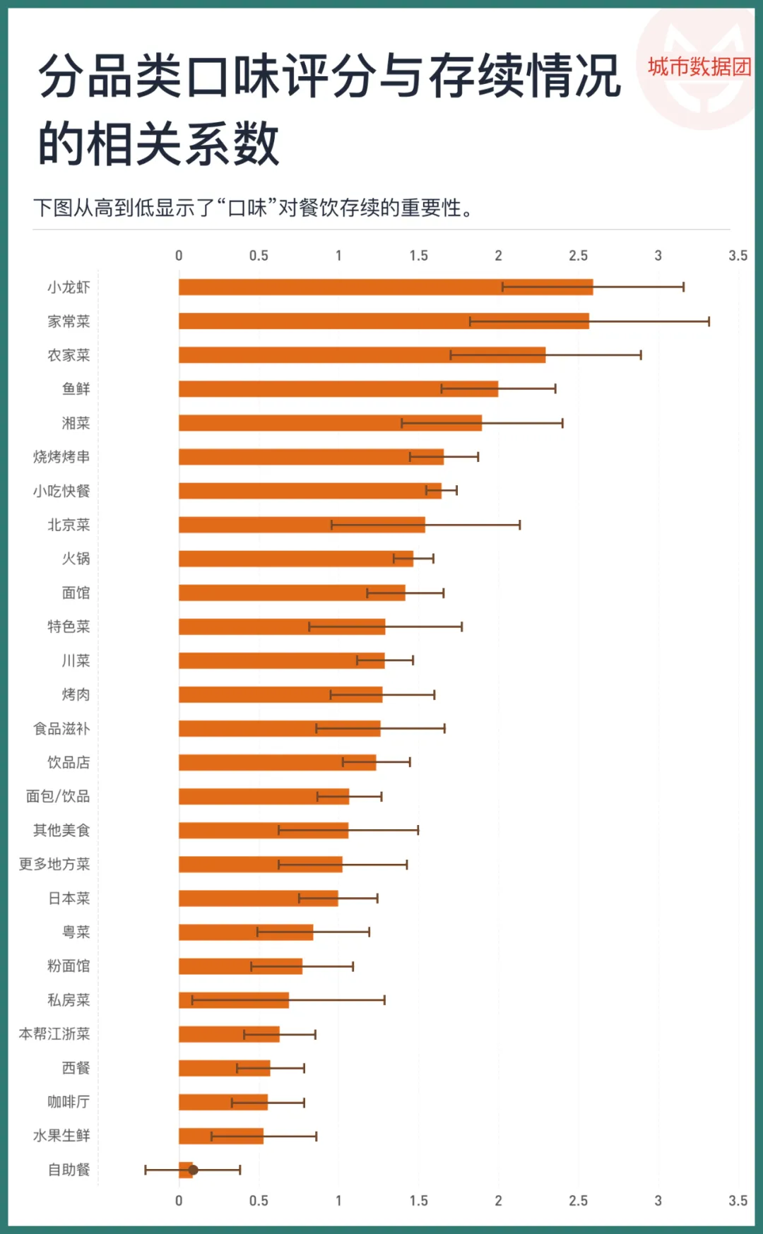 上图从高到低显示了“口味”对餐饮存续的重要性。对口味最敏感的餐饮品类,即“口味”系数图中排名最靠前的,是小龙虾、家常菜与农家菜。在这些品类,口味评分在很大程度上决定了店铺是否能够继续开业,这些店的口味稍微差一点,就不会再有人品尝。相比之下,自助餐、水果生鲜、咖啡厅和西餐的存续不太受到口味的影响。