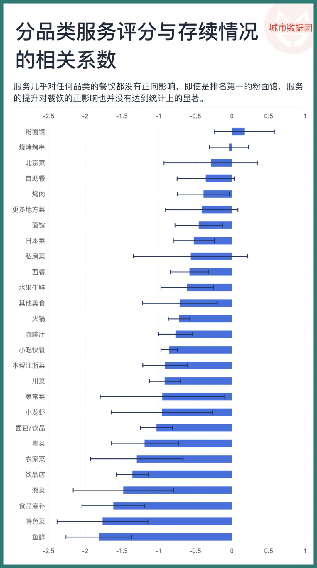 上图呈现了“服务”评分对不同种类餐饮的存续影响系数。可以看到,服务几乎对任何品类的餐饮都没有正向影响,即使是排名第一的粉面馆,服务的提升对餐饮的正影响也并没有达到统计上的显著。反过来,在鱼鲜、特色菜、食品滋补和湘菜等品类,服务越好,反而店铺关门的概率会更大。
