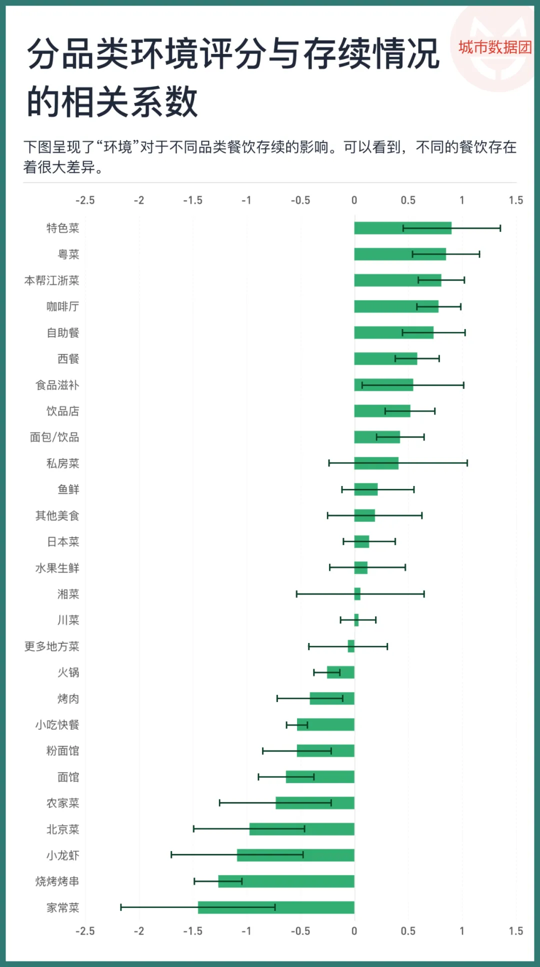 上图呈现了“环境”对于不同品类餐饮存续的影响。可以看到,不同的餐饮存在着很大差异。在特色菜、粤菜、本帮江浙菜和咖啡厅等品类的餐饮中,环境更好,存续概率会有显著提升。而在家常菜、烤肉烤串、小龙虾、北京菜等品类中,环境较差的店反而有更高的存活率。
