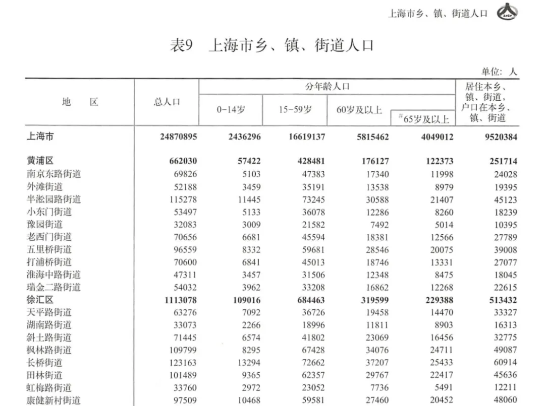 第七次人口普查的乡、镇、街道资料包括了上图呈现的这些变量,即总人口、三大年龄段人口(其中老人年龄段包括60岁及以上和65岁及以上两个口径)以及居住在本乡镇街道,户口也在本乡镇街道的人口。