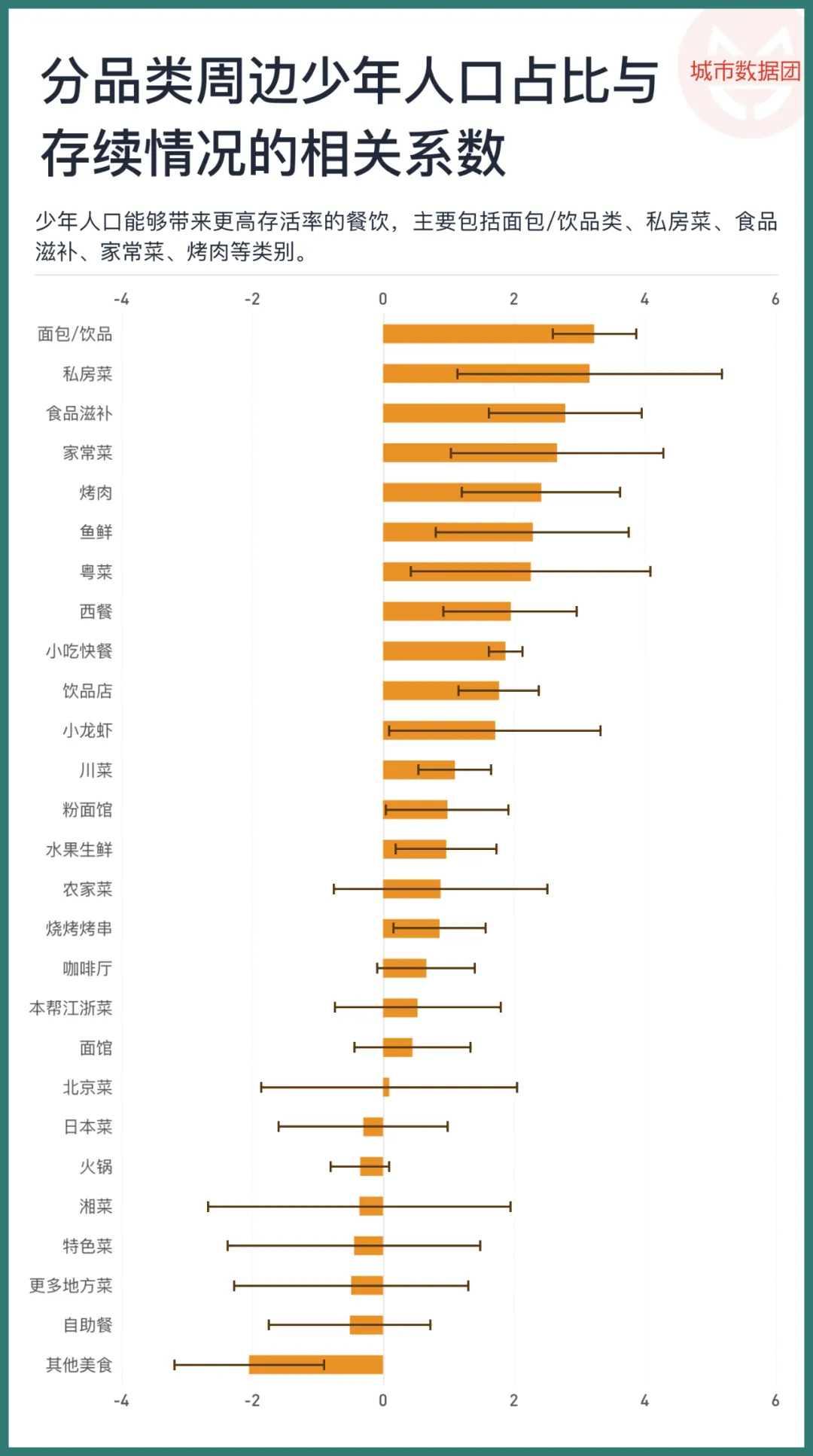 上图显示,少年人口能够带来更高存活率的餐饮,主要包括面包/饮品类、私房菜、食品滋补、家常菜、烤肉等类别。除了“其他美食”品类,少年人口即使没有显著的正向影响,也少有负向影响。