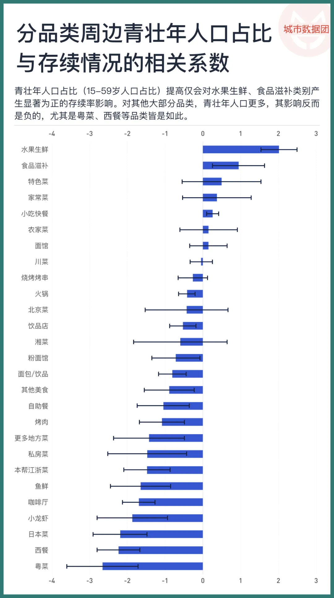 上图显示,青壮年人口占比(15-59岁人口占比)提高仅会对水果生鲜、食品滋补类别产生显著为正的存续率影响。对其他大部分品类,青壮年人口更多,其影响反而是负的,尤其是粤菜、西餐等品类皆是如此。