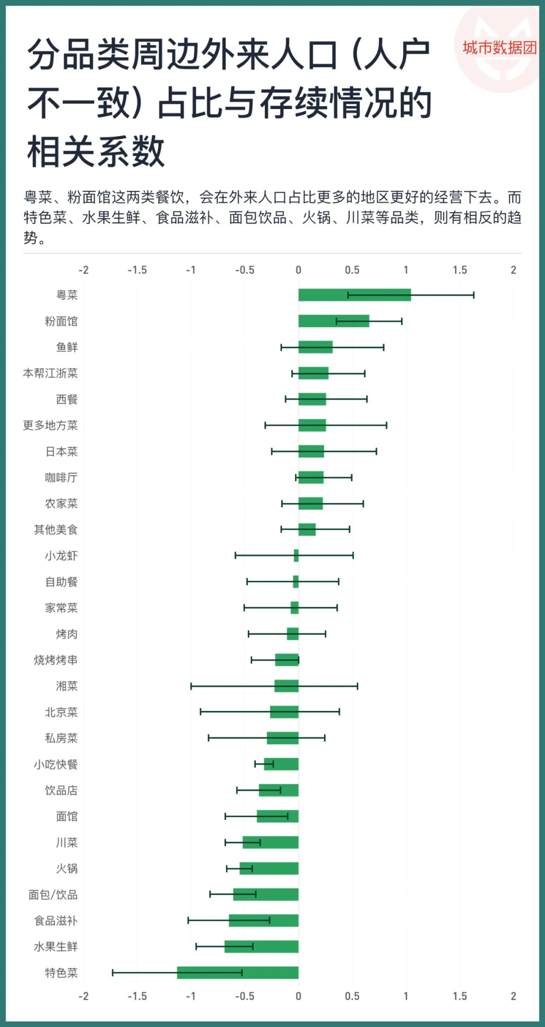 在人口特征上,少年人口占比提升对存续率的影响更为正面。青壮年人口占比的提升常常与更低的存活率相关。外来人口占比的提升,可能会让该地区的粤菜馆和粉面馆更容易生存下去,但却使特色菜、水果生鲜等品类的存活率降低了。