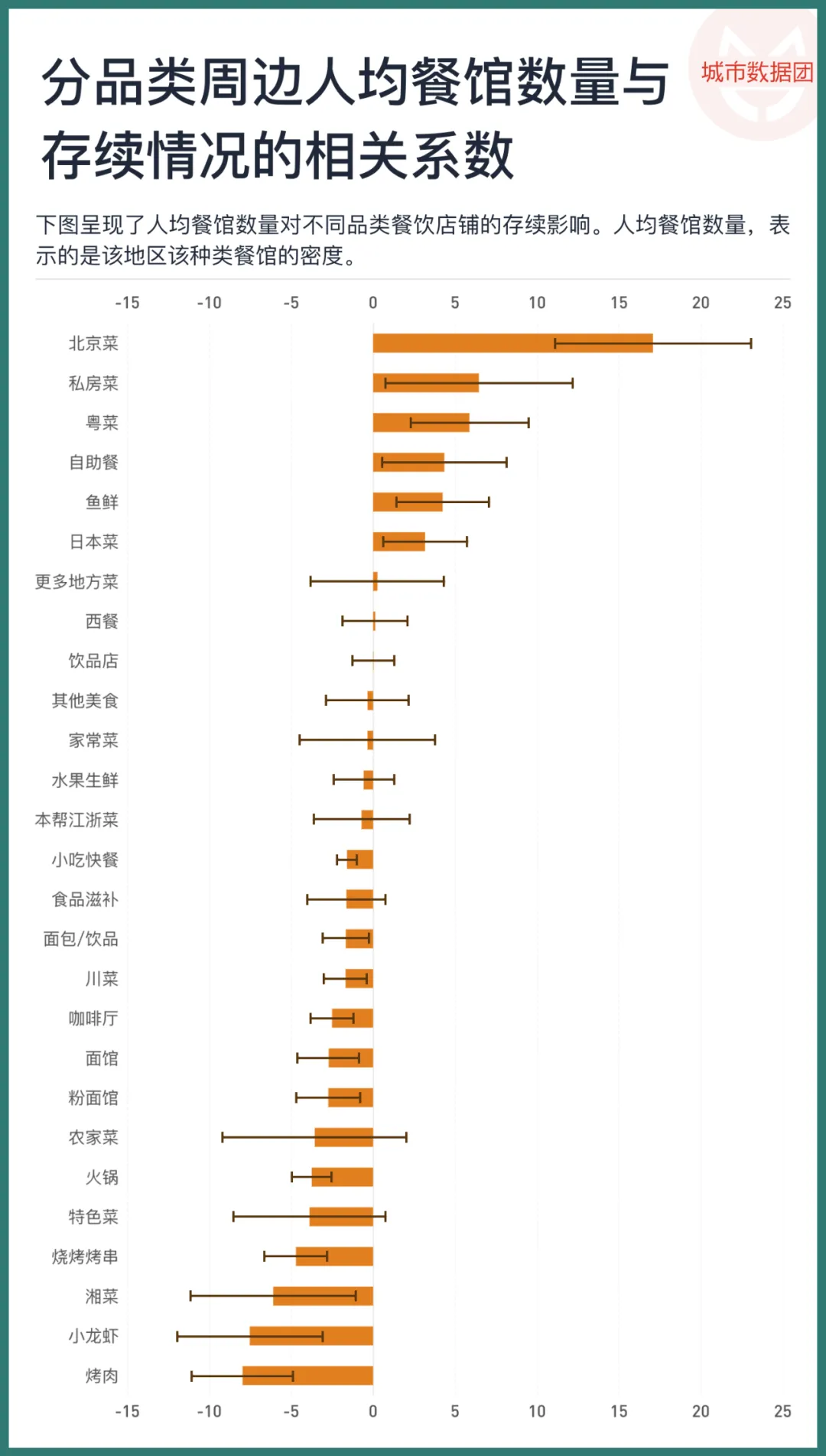 在人均店铺这一竞争性指标上,一些品类体现了更强的竞争性,例如小龙虾、烤肉,一个地区有一家就够了,有你没我。另一些品类则似乎从集聚中获得了更多好处——一个街道开了更多北京菜馆子,反而使想吃北京菜的人们更多地来到这个街道,弥补了竞争的损失,让每一家店的存活率都更高了。