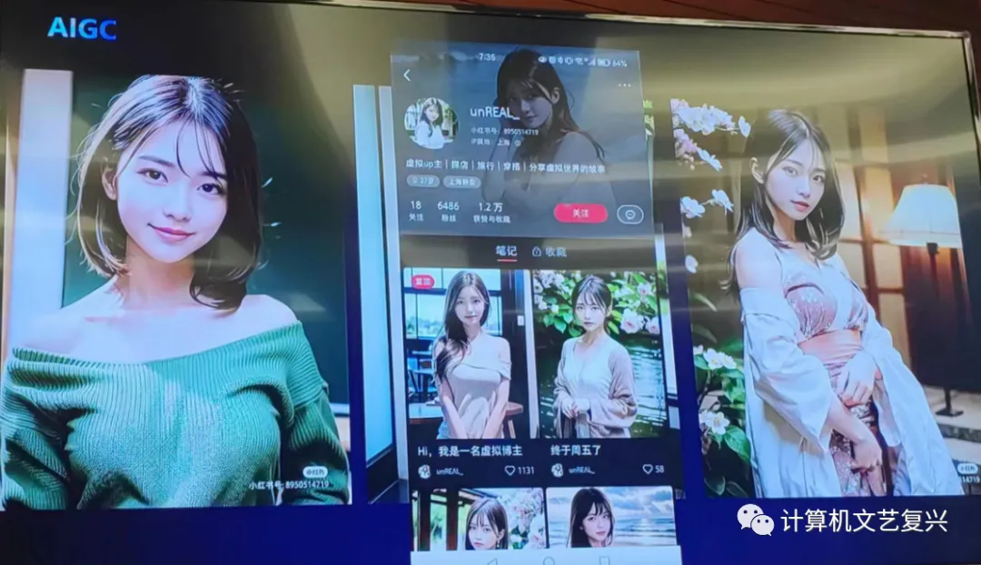 我们看看现在大模型的最典型的应用,可能AIGC是现在大家普遍关注的一个场景。你从左边和右边基本上看不太出来是哪个是全息合成的,哪个是人合成的,有的时候我们认为计算机合成的背景稍微模糊一些,但是现在基本上已经迭代过去了。然后包括AIGC已经开始有商业化的模式在做,这是小红书上的一个虚拟偶像。