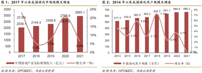 本周A股市场整体呈现震荡走势,赛道股的波动较为剧烈,在这样的行情下,投资者很容易追高被套。在上周六的钱瞻研报中,钱研君分享了一个攻守兼备的行业——化学发光行业,而在本周,白金版中重点关注的3家公司,本周最高涨幅都在5%-10%,表现还可以。本周四,我们发布上线了《每经投资研究院7月月刊》,老铁们应该还需要一些时间去消化。有鉴于此,今天钱研君就不再推出白金版的钱瞻研报了。不过大家也不用失望,本次钱瞻研报特别版分享的行业,同样具有攻守兼备的特征,接下来钱研君就和大家分享一下游戏行业的投资逻辑。这里和已经购买过《钱瞻研报2022》的老铁汇报一下,本期钱瞻研报是特别版,也就是说本期只有免费版,没有白金版。因此,这一期是不算在《钱瞻研报2022》打包产品里面的。游戏,伴随着一代又一代人的成长,已经成为1980年以后出生人群生活的一部分。随着游戏渗透率逐步接近天花板,传统的游戏充值购买业务带来的行业规模增长,也已经回归平稳,行业整体增速下滑已经是不争的事实。2021年中国游戏产业实际销售收入为2965.1亿元,同比增长6.4%,增速有所放缓;2017-2021年行业规模复合增速为9.9%。2014年以来,我国游戏用户规模保持低速稳增,2018年突破6亿人,2021年游戏用户规模同比增长0.2%至6.7亿,2014-2021年复合增速为3.7%。