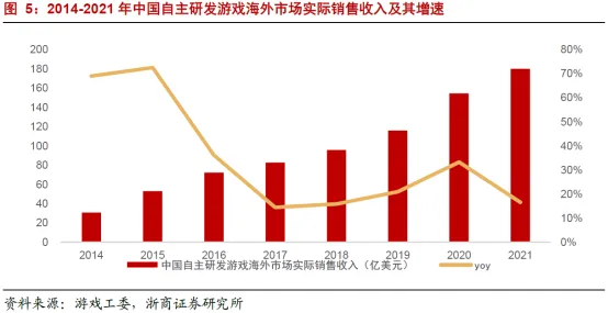 浙商证券判断,随着供给侧的出清,行业龙头公司的研发费用率有望进入下行周期,周期或在3年甚至更久。根据中国游戏产业报告数据,2021年中国游戏海外市场收入达180亿,相比2019年的复合增速达25%。考虑到2020年有疫情因素,浙商证券使用的是2年复合增速,如果再减去没有增长的端游页游,增速会更高。随着国内版号的收紧,以及未来监管政策的不确定性,国内游戏公司在立项之初,就按照全球化发行进行计划,这将带来未来优质产品的进一步增加。因此,后期海外游戏市场有进一步加速成长的可能性。