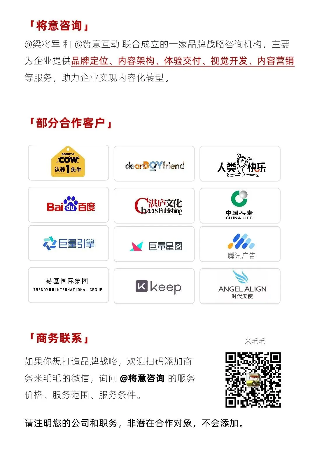 「将意咨询」是我和赞意互动联合成立的一家品牌战略咨询机构,主要为企业提供品牌定位、内容架构、体验交付、视觉开发、内容营销等服务,助力企业实现内容化转型。