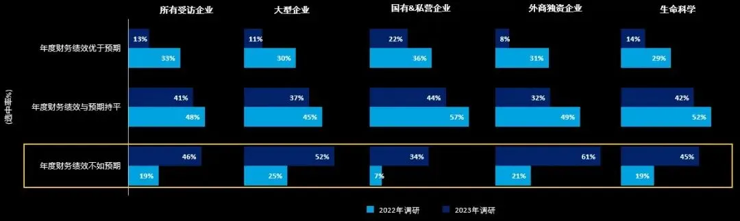 由于极为特殊的营商环境,外资企业(外商独资)在2022年受到的冲击最大,调研中有61%的外企表示年度业绩不如预期。