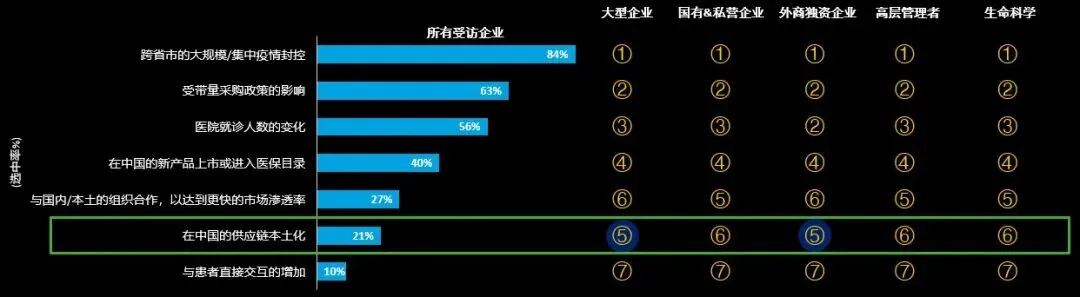带量采购等医改政策依旧是影响最长远的因素,对私营企业(71%)、大型企业(69%)和生命科学企业(63%)的影响尤为严重。