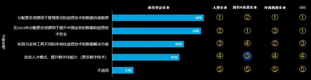数字领域依旧是各类企业的投资重点,国有&私营企业表示他们将在2023年分配更多资源用于提升数据与信息技术安全,而外企则会维持相近的资源分配量(也出于合规性管理)。