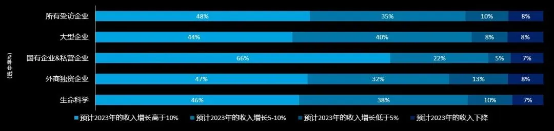 近50%的企业寻求高于10%的收入增长,对2022年12月7日中国防疫优化政策出台后的前景十分看好。值得一提的是,本土企业(国有&私营企业)对新一年的期待值最高,本次调研中有2/3的中企预计2023年的收入增长高于10%。