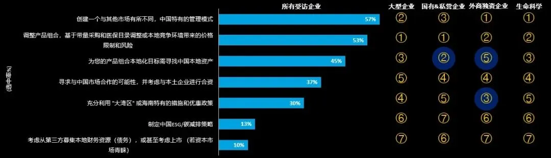 “中国市场特有方案”的排名由前一年的第二位升至第一位 – 表明中国生命科学与医疗市场的“独特性”受到更高的重视,且对外商独资企业(61%)与生命科学企业(58%)尤为重要。