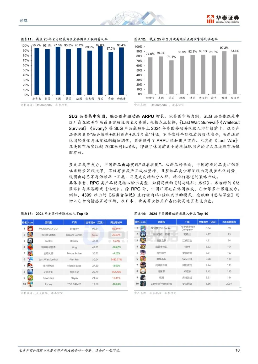 中国游戏出海动能充沛,海外市场红利仍存中国自研游戏出海收入 25Q1-Q3 同比增长 5.6%,2019-24 年间,从 116亿美元增长至 185.6 亿美元,CAGR 为 9.1 %。海外市场红利仍存,新兴市场如东南亚和中东在用户活跃度和增长潜力上表现强劲。欧美等成熟市场用户规模趋于饱和,但精品游戏价值释放,2025 年以来点点互动《WhiteoutSurvival》等跻身美国收入榜前列,印证中国厂商差异化内容与本地化运营突围。我