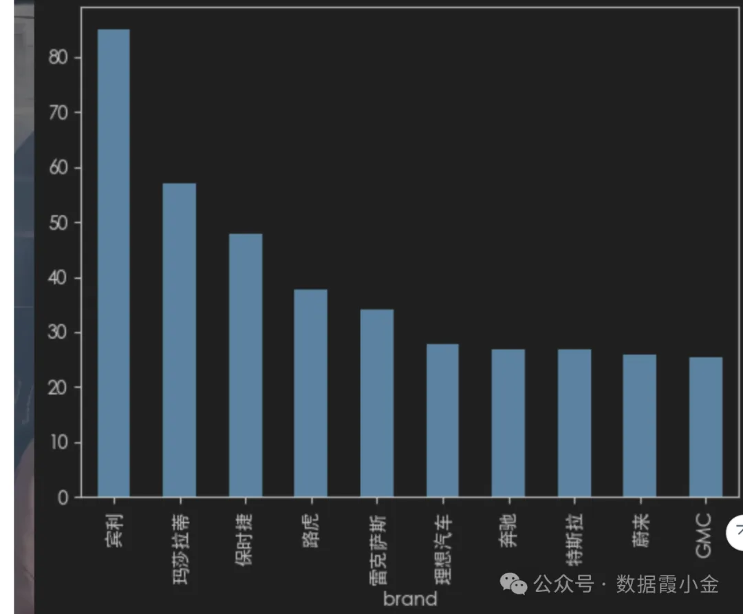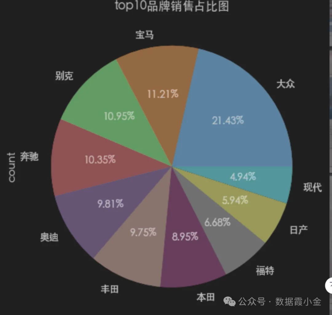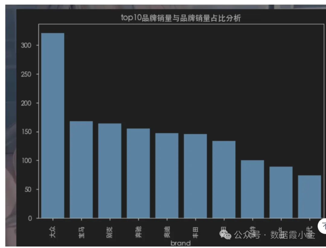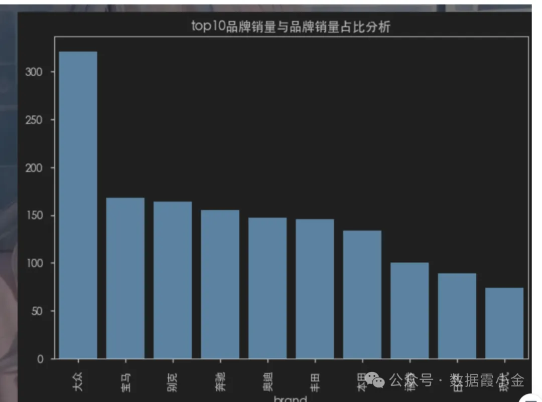 # 获取top10品牌销售的数量# df['brand'].value_counts().sort_values(ascending=False).head(10)amount_top = df['brand'].value_counts(sort=True).head(10)#%%# 通过bar图查看数据### top10品牌销量与品牌销量占比分析### top10品牌销量与品牌销量占比分析amount_top.plot(kind="bar", title='top10品牌销量与品牌销量占比分析')plt.bar(amount_top.index, amount_top.values)#%%# 通过pie图查看数据的占比amount_top.plot(kind='pie', autopct='%.2f%%', title='top10品牌销售占比图')# ----------plt.pie(amount_top, labels=amount_top.index, autopct='%.2f%%', )#%%# 切换plt的主体# 查看支持的主体# plt.style.available# 使用主体# plt.style.use('seaborn-v0_8-notebook')#%%