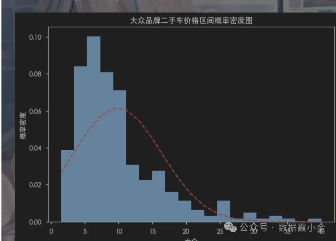 # 筛选数据df_dazhong = df[df['brand']=='大众']df_dazhong.head(5)#%%# 计算大众品牌的车辆的不同价格区间的概率密度函数from scipy.stats import norm# norm.pdf(分布的区间, 均值, 标准差)# 获取价格的区间num_bins = 20# 绘制直方图# density控制直方图是否进行归一化。 默认是True,直方图的纵轴表示概率密度,而不是样本的数量n, bins, patches = plt.hist(df_dazhong['price'], num_bins, density=True)# 获取均值dazhong_mean = df_dazhong['price'].mean()# 获取标准差dazhong_std = df_dazhong['price'].std()y = norm.pdf(bins, dazhong_mean, dazhong_std)# 将概率密度值绘制到直方图上plt.plot(bins, y, 'r--')# 设置标题plt.title('大众品牌二手车价格区间概率密度图')# 设置x轴的名称plt.xlabel('大众')plt.ylabel('概率密度')#%%