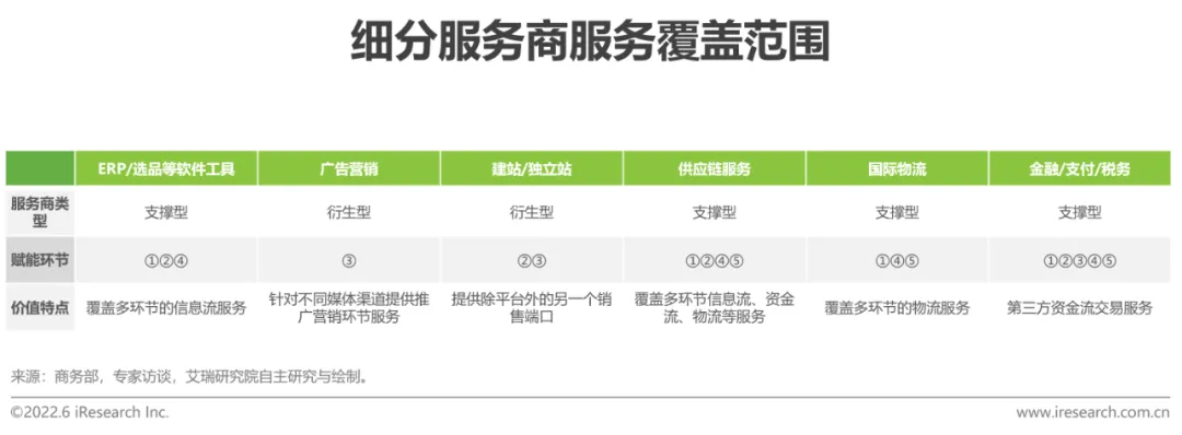 跨境电商服务行业为跨境电商企业在出海的各个环节上提供专业产品及服务。跨境电商服务可分为软件工具、广告营销服务、建站独立站服务等多种类型,为企业实现降本增效。