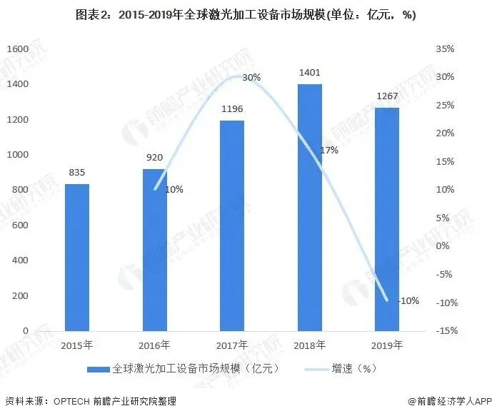 全球激光加工设备市场规模超过千亿元,2019年达到1267亿元,同比下降10%。