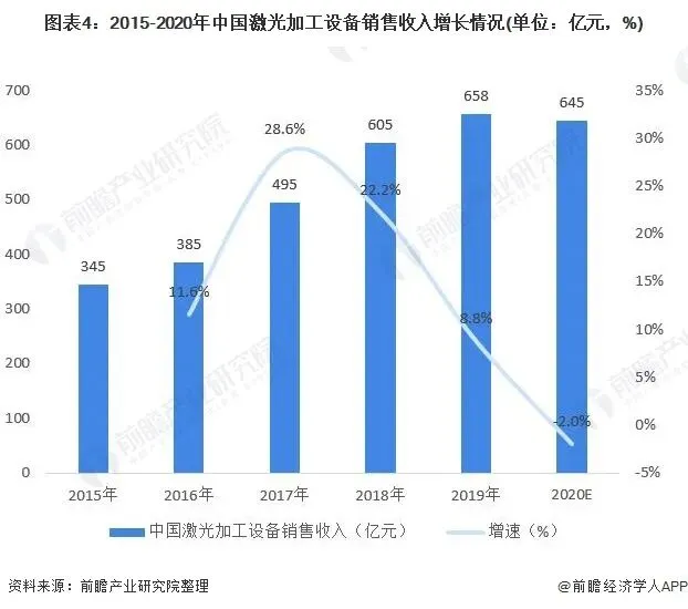 中国激光加工设备销售收入约为全球的一半,2015-2020年中国激光加工设备销售收入持续增长,2019年达658亿元,2020年初步估计达到645亿元。