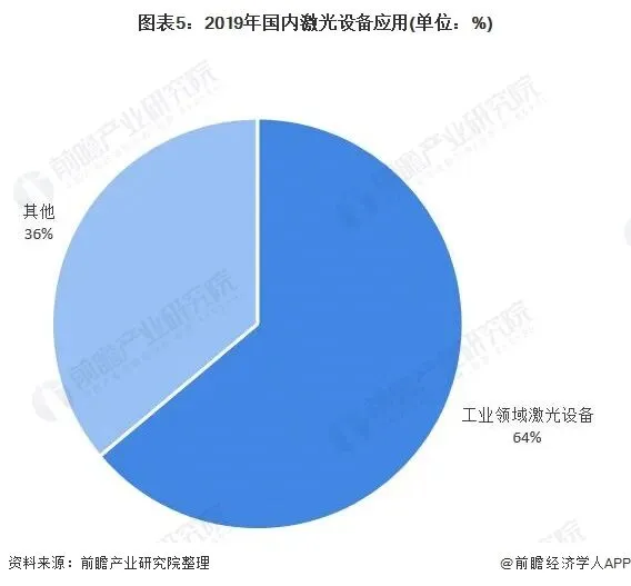 相对于全球激光设备应用领域,国内激光设别应用较为单一与集中,64%的比重应用于工业领域。