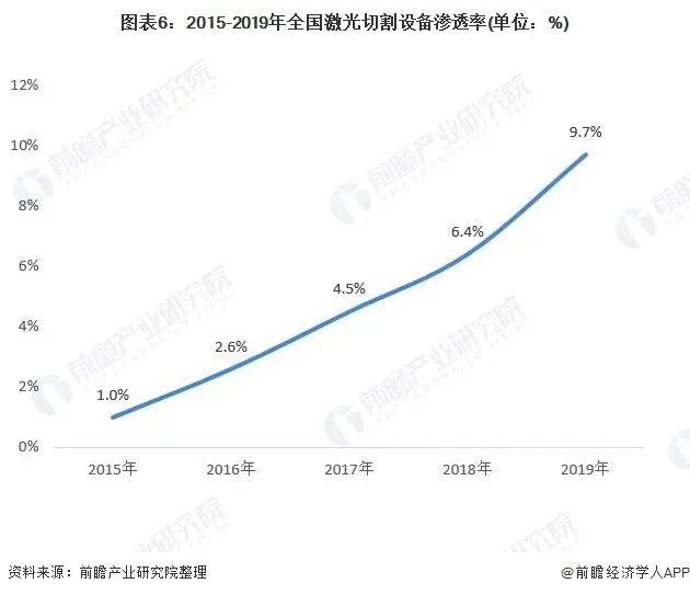 相对于国际激光设备制造与应用,我国激光切割设备渗透率较低,欧美发达国家已经步入“光加工”时代,我国激光加工设备应用渗透率相对国际水平较低,2019年我国激光切割设备销量仅为金属削机床销量的9.7%,不到10%,占比较低。