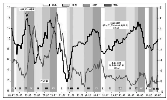 根据上述指标,美林将1970—2007年的美国经济划分为4个经济周期:第一个周期为1974年12月—1980年4月;第二个周期为1980年4月—1990年11月;第三个周期为1990年11月—2001年5月;第四个周期为2001年5月—2007年。美林证券对经济周期的划分在总的趋势上和NBER并无大的区别,在小的时间点上略有出入。其中第一周期和第二周期相对时间较短,构成也相对较为简单,从时间长度上可以理解为是2个基钦周期,它们构成了1个朱格拉周期;而第三、第四周期相对较为复杂,是2个朱格拉周期。