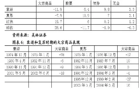 美林证券把经济周期中各阶段大宗商品的表现进行了详细统计,具体数据如下: