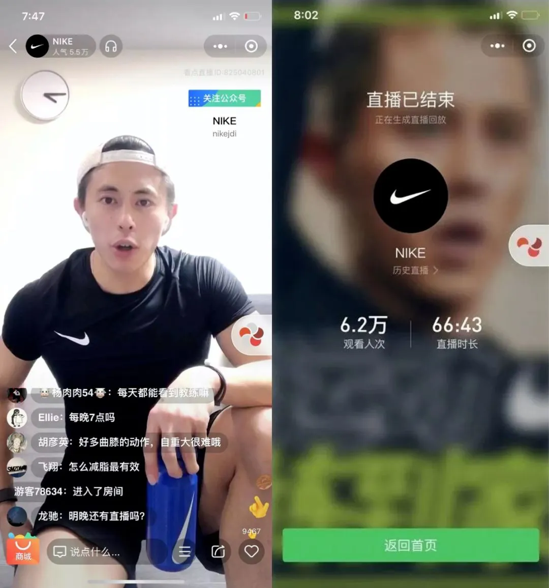 疫情中,我们看到诸如Nike这样的品牌推出了多位教练的在线直播训练课程,利用了微信平台的社交优势和看点直播小程序的能力,一键即达的预约方式结合用户热点的新趣文案,让品牌的“老朋友”快速转化,甚至主动将活动信息辐射到自己的社交圈。