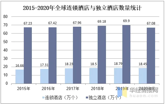 2015-2020年全球连锁酒店与独立酒店数量统计