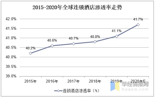 近年来全球连锁酒店渗透率稳步提升,据统计,全球连锁酒店渗透率从2015年40.2%提升至2019年41.1%,预计2020年全球连锁酒店渗透率为41.7%。