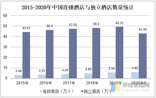 2015-2020年中国连锁酒店与独立酒店数量统计