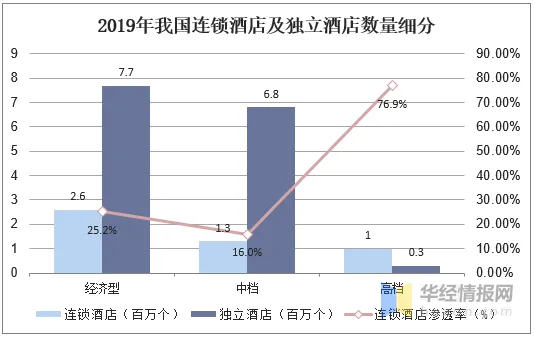 随着经济持续发展及家庭财富的持续增加、交通更加便利及城市化持续提升,人民出行旅游对酒店的要求也越来越高,尤其是中端酒店,行业升级化趋势明显。2019年我国经济型连锁酒店渗透率为25.2%,中档连锁酒店渗透率为16%,高档连锁酒店渗透率为76.9%。