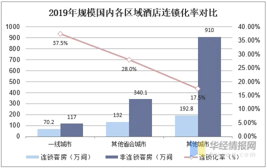 从一线城市酒店业设施连锁化率来看,连锁客房数是70.2万间,非连锁客房数是117万间,酒店连锁化率占38%。从副省级城市及省会城市酒店业设施连锁化率来看,连锁客房数是132万间,非连锁客房数是340.1万间,酒店连锁化率占28%。从其它城市酒店业设施连锁化率来看,连锁客房数是192.8万间,非连锁客房数是910万间,酒店连锁化率占17%。