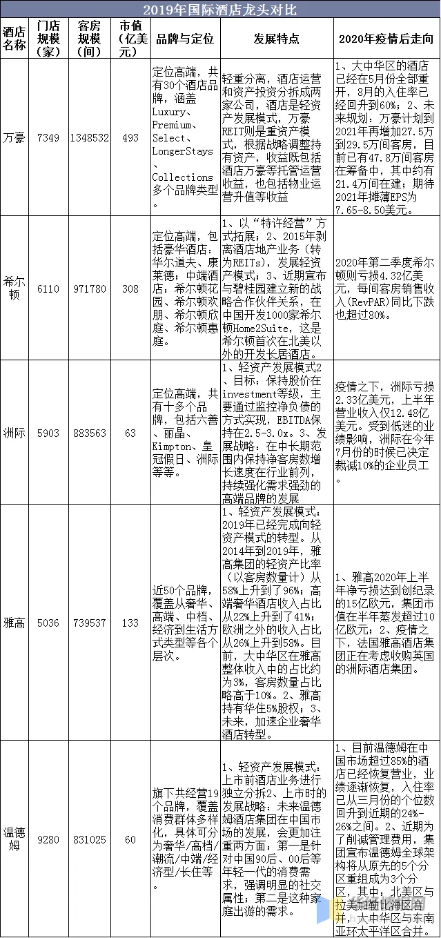 目前来看,国际酒店龙头主要包括万豪、洲际、希尔顿、雅高、温德姆等酒店集团,多数定位偏高端,客房规模可观,其中万豪客房规模排名第一。具体各酒店目前客房规模、市值及品牌定位、发展特点如下表所示: