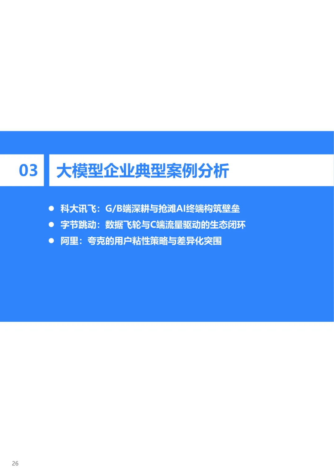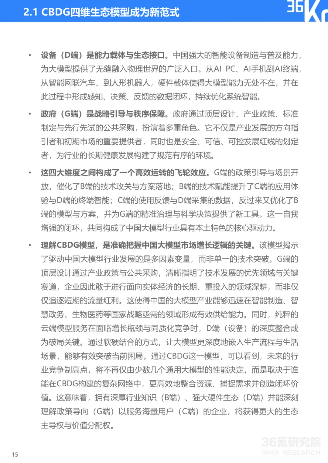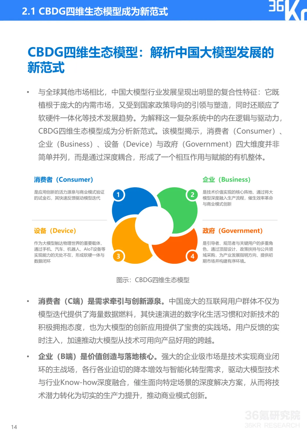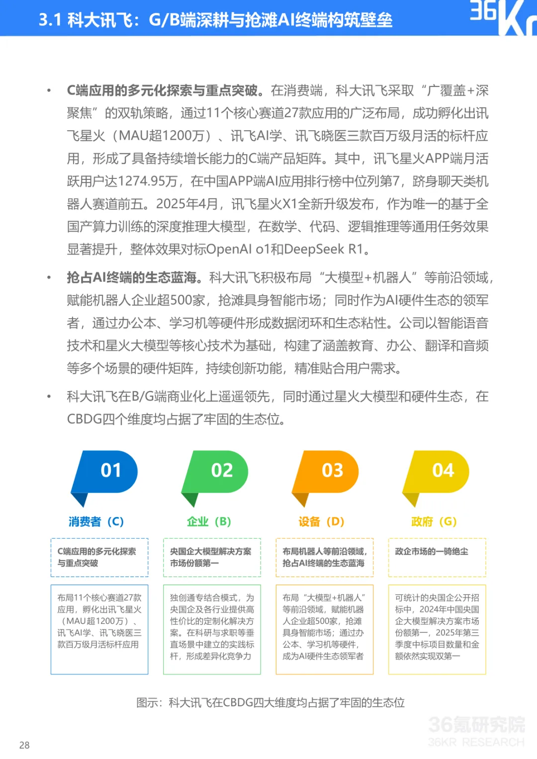 导读:报告聚焦中国大模型行业发展现状与趋势,提出 CBDG 四维生态新范式,揭示行业从技术单点竞争转向体系化较量的核心逻辑。大模型已成为国家科技创新与产业安全的战略支点,政策体系形成 “创新驱动、基础强化、场景牵引、安全治理” 四位一体格局。CBDG 四维生态(消费者、企业、设备、政府)构成行业发展核心框架,四大维度深度耦合形成飞轮效应,主导行业增长逻辑。市场竞争聚焦生态构建、技术研发、行业赋能、商业变现与创新拓展五大能力,政企市场成为商业化主阵地,具身智能与多模态融合成为技术突破方向。头部企业呈现差异化路径,科大讯飞深耕 G/B 端并布局 AI 终端,字节跳动依托 C 端流量与数据飞轮构建生态闭环,阿里通过夸克工具集实现差异化突围。未来技术将向多模态融合、智能体化、具身智能演进,产业价值链向应用与服务层聚集,治理体系聚焦安全可信与国际竞合,推动行业高质量发展。