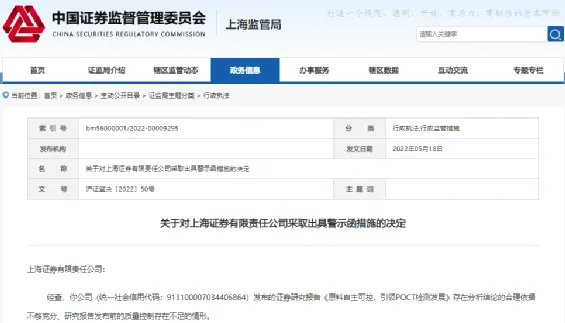 6月17日,上海证监局公布两份行政监管措施公告显示,因发布研报存在分析结论的合理依据不够充分、研究报告发布前的质量控制存在不足的情形,上海证券被出具警示函,副所长及分析师本人也被要求前往上海证监局接受监管谈话。