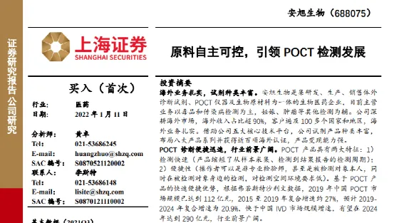 1月11日,上海证券研究所发布安旭生物个股研报,题为《原料自主可控,引领POCT检测发展》,报告全文长达40页。
