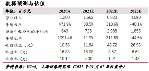在“投资建议”中,上海证券给出推荐“买入”评级,并预计安旭生物2021年至2023年将实现归母净利润7.26亿元、29.88亿元、16.55亿元,同比增长11.9%/311.5%/-44.6%,对应PE估值为15.08倍/3.67倍/6.62倍(以1月7日收盘价计算)。